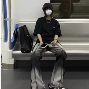 Retro style straight leg jeans for female niche design, loose and multi pocket wide leg pants for women’s jeans