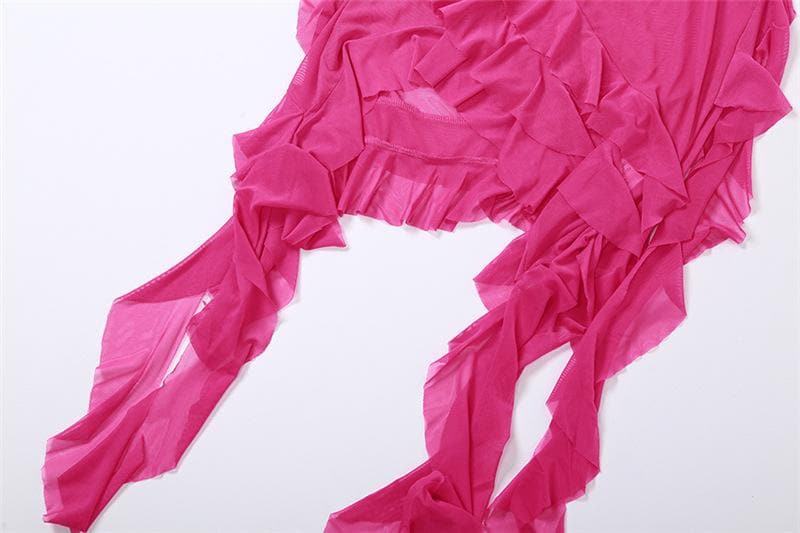 Be the first to review “See through halter sheer mesh ruffle flower applique mini dress”
